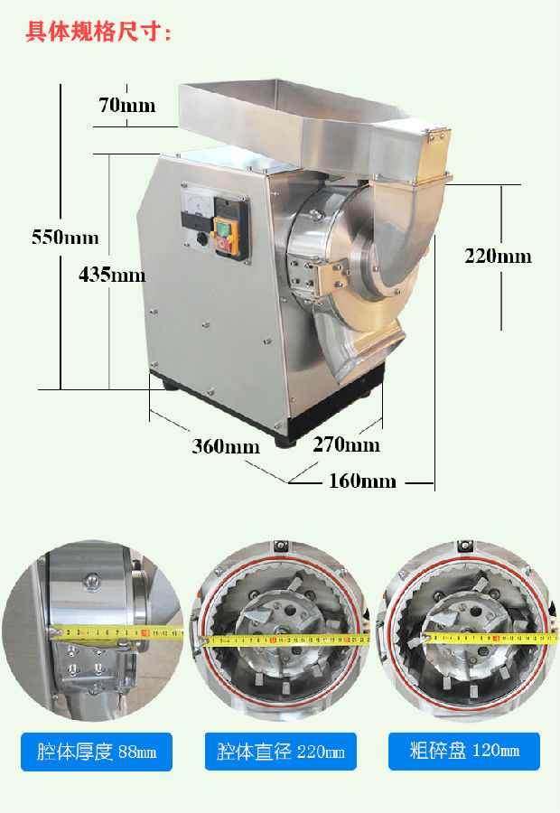 本机为五谷杂粮粉碎机,结构简洁、坚固,运转平稳,粉碎物料快速、均匀,效果良好。本机全为不锈钢材料制作,机壳内部(粉碎槽)所有齿槽经精密机加工从而达到表面平滑,易于清理,改变了普通粉碎机内壁粗糙、易积粉、难清理的现象,使食品、药品、化工等生产更能符合规定GMP的卫生要求。